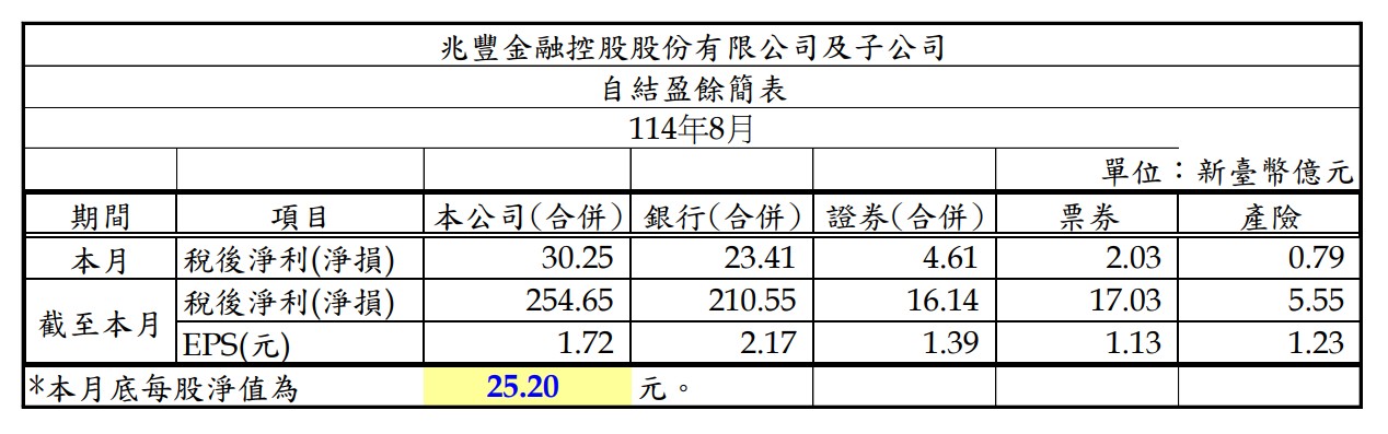 兆豐金8月自結稅後盈餘30.25億元,優於去年同月自結的23.29億元;累計今年前8月稅後盈餘254.65億元,稅後EPS為1.72元,低於去年同期自結的269.16億元、1.82元。