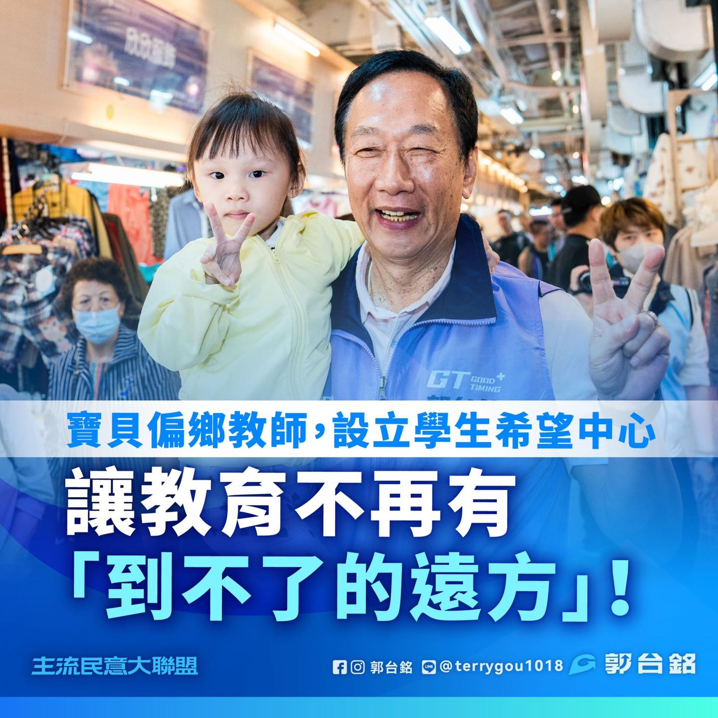 剛送出103萬份連署書的總統參選人郭台銘,今(3)日再提教育平權政策,承諾提高偏遠及高山地區教師加給每月5,000元起跳;偏鄉與高山地區服務滿15年教師,政府提供5至10年房貸平均利息補貼;在偏鄉與高山地區增設「學生希望中心」;政府編列預算設立「大專學生協助弱勢族群課業輔導計畫」,利用AI人工智慧與數位科技,協助雙語教學及教學輔具。
