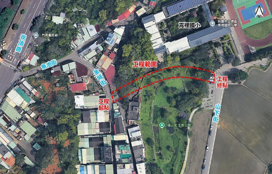 工程開闢八德區金城街至山下街寬度之新闢道路,使崁頂路之車輛可經魚池街至金城街並直接通往山下街,以達到路網優化、縮短通行時間,並紓解學區周邊車流,提升整體動線順暢性。計畫道路長度約為103公尺、寬度8公尺,設計方案採雙向車道配置銜接既有道路,道路新建工程經費約新臺幣4,950萬元,設計監造由佺葉工程顧問有限公司辦理,施工單位為遠城營造有限公司。