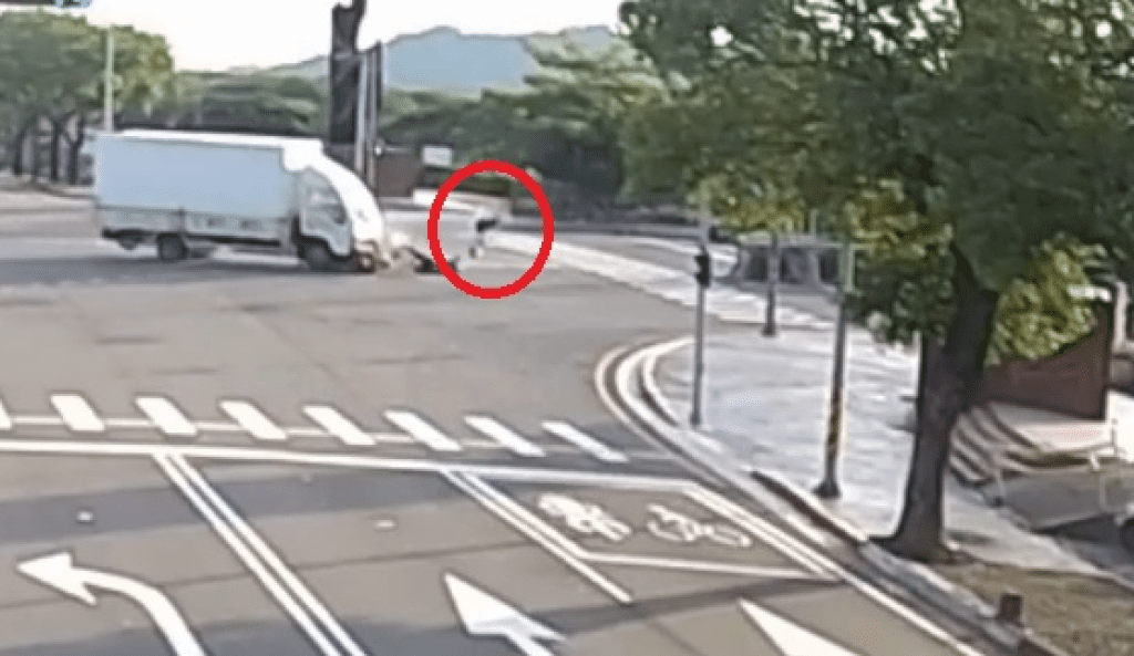 苗栗大貨車違規左轉,撞飛機車騎士及乘客。翻攝畫面