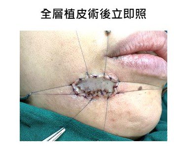 曹醫師經過綜合研判,製訂出治療方策,採取兩階段性治療:第一階段執行凸白疤全切除+全層植皮術,使凸白疤形狀變成平白疤,且同步改善唇形右下偏斜及去除創傷性刺青。等痊癒後,再進行第二階段之白疤顏色再生術,使白疤顏色轉呈正常膚色,因而就可使凸白疤看不見了。