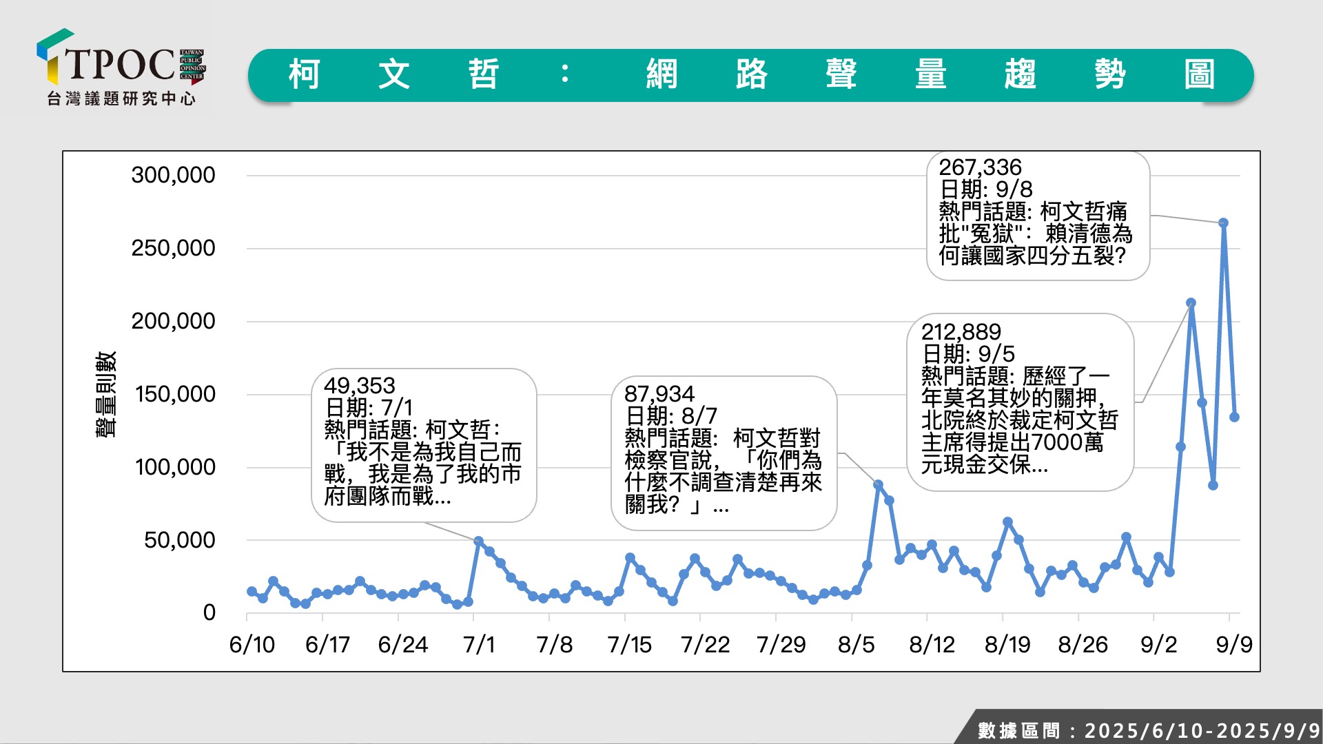 TPOC台灣議題研究中心透過QuickseeK快析輿情資料庫,蒐集柯文哲最近3個月網路輿情聲量數據,調查期間內每日平均聲量約達3.3萬餘則,其中首波聲量高峰來自7月1日,熱門話題為柯文哲臉書,該文質疑朱亞虎證稱威京集團於2020年捐210萬,只是政治獻金 ,批評檢方疲勞偵訊、涉及不正訊問,當天創下超過4.9萬則聲量;第二波聲量高峰來自8月7日,台北地院傳喚時任台北市政府副秘書長李得全作證,柯文哲在休庭時爆粗口、朝檢察官丟水杯及撒卷宗,引發討論,當天聲量超過8.7萬餘則。