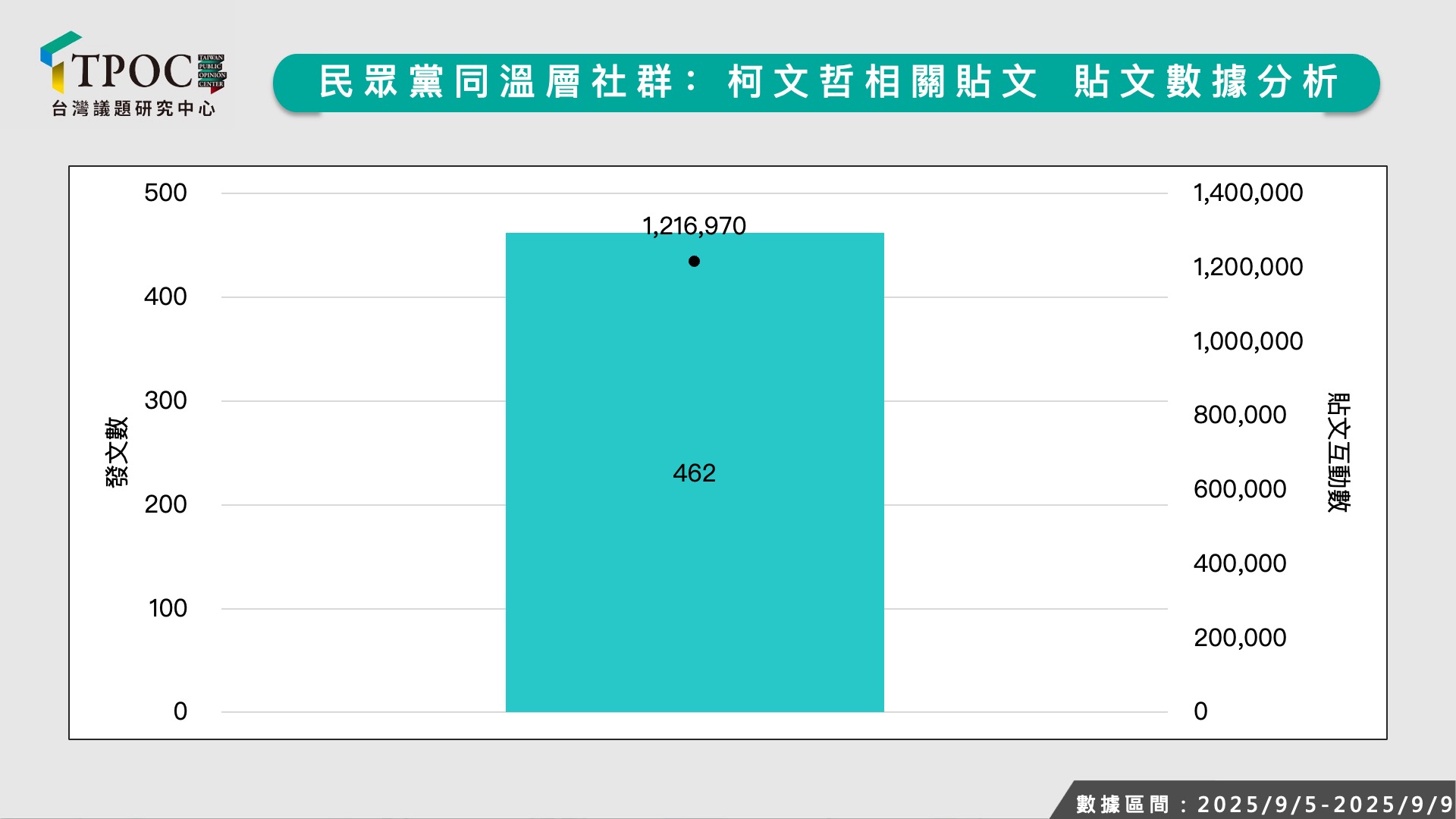進一步分析白營社群同溫層數據,自柯文哲交保後,民眾黨支持者們「動得很厲害」,發文數方面,短短4天就累積超過400多則討論,而在互動數部分更高達121.6萬多次,展現強烈動能。熱門貼文方面,柯文哲透過社群平台發布的幾篇貼文都受到高度關注,包括宣示「絕不投降,絕不屈服!繼續努力!」互動數超過15萬則,而民眾黨發言人吳怡萱紀錄柯文哲回家探視媽媽的文章,以及黃國昌稱7000萬元現金交保「即便對一個醫師家庭,仍是難以承受的沈重負擔」,也獲得高度矚目,互動數超過6萬多則。