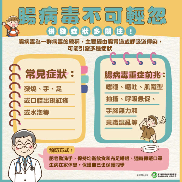 衛生局進一步補充,腸病毒常見症狀包括發燒、喉嚨痛及手足口病,嚴重時可能引發腦膜炎或心肌炎,幼童照顧者需高度警覺,如發現幼童出現嗜睡、意識不清、活力不佳、手腳無力或麻痺、肌抽躍(無故驚嚇或突然間全身肌肉收縮)、持續嘔吐與呼吸急促或心跳加快等腸病毒重症前兆病徵,請儘速送到大醫院接受治療。