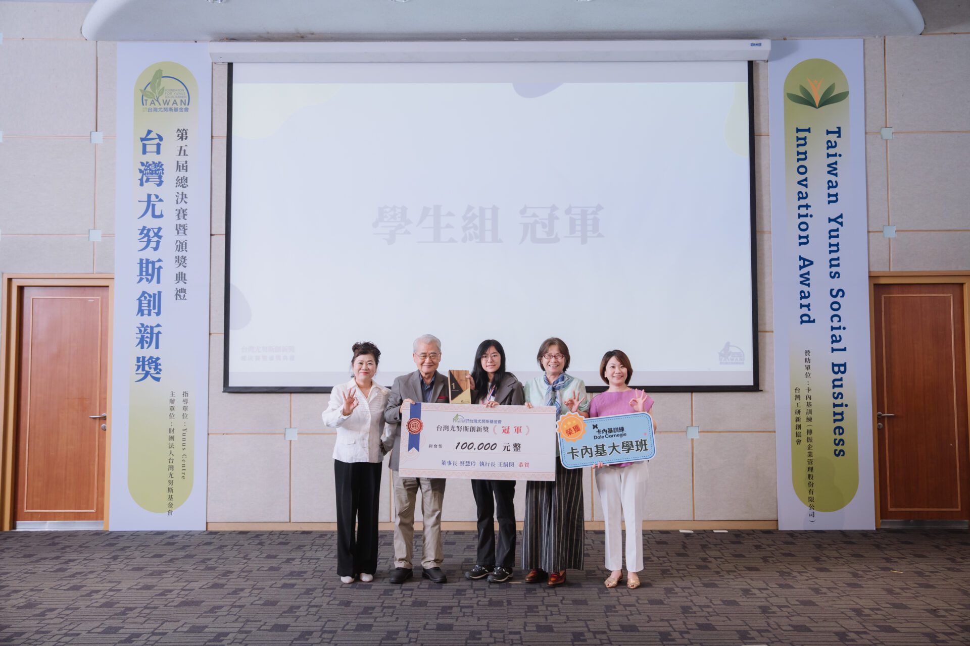 財團法人台灣尤努斯基金會主辦第五屆台灣尤努斯創新獎總決賽於9月27日假集思交通部國際會議中心舉辦圓滿落幕。最終由「台灣生物循環科技股份有限公司」獲得社會組冠軍,其專注於提供有效對抗氣候變遷的有機廢棄物全解決方案,促進全面再利用;「TAIWAN DYE」、「厝邊 MyNeighbor」則分別摘下亞軍及季軍殊榮。以及「貓咪把指甲咬掉了」榮獲學生組冠軍,其設計結合印章與剪刀功能的指甲剪,讓高齡長輩可以更安全的剪指甲,亞軍及季軍分別為「D’Ventura」、「Emoto」。獲獎隊伍的多元組成也可見台灣尤努斯創新獎的多元與創新性。總決賽結合永續理念,特別選用「國產材」製成的獎盃,參賽團隊午餐飲食採用循環餐盒,讓競賽細節同時結合「零淨碳排放」的願景。