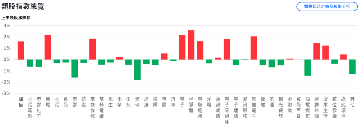 台積電盤中強漲逾3%達1370元,市值突破35.53兆元,貢獻大盤約322點,電子權值股滿面通紅,鴻海、緯創、台達電、光寶科、廣達、大立光、日月光投控全面勁揚。