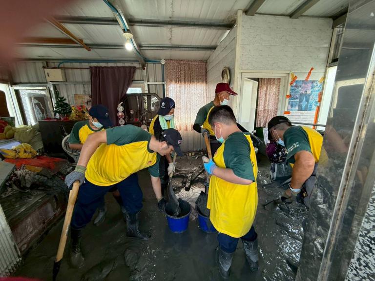花蓮馬太鞍溪堰塞湖溢流重創光復鄉,佛光人不辭辛勞,逾1500人次挺進災情最嚴重的佛祖街、馬太鞍部落,佛光人手持鏟子及刮泥耙,奮力沖刷淤積爛泥,賣力的清淤!