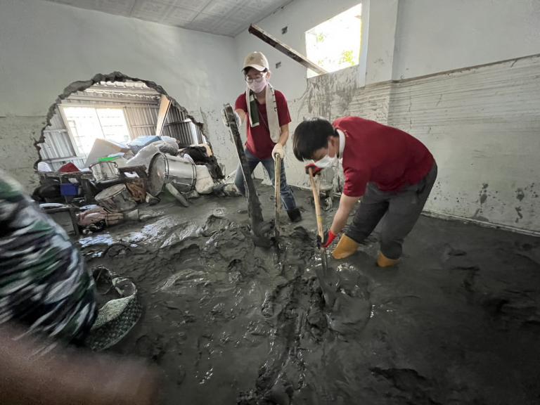 ▲佛光青年前進馬太鞍部落,將屋內及膝的泥濘鏟除,協助居民清理家園。(圖/佛光山提供)