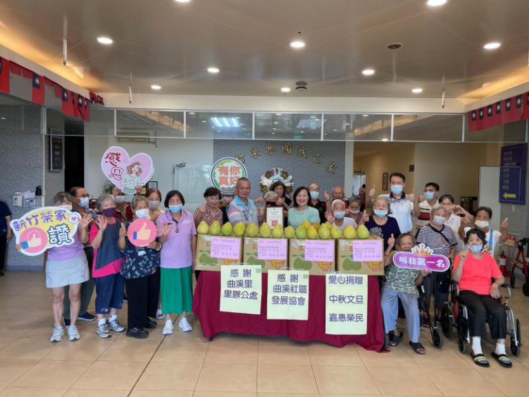 曲溪社區發展協會理事長朱佑麒、曲溪里長廖成章秋節前夕,攜帶三灣盛產香甜文旦至新竹榮家,贈送榮家長輩們歡度中秋佳節,榮家主任白恩惠率團隊及住民長輩代表接受,長輩們開心地與文旦合影,氣氛熱鬧歡樂,這批飽滿可口的文旦將在新竹榮家中秋聯歡晚會中與住民分享。