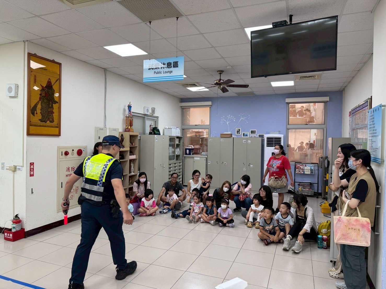 此外,新屋分駐所也特別融入「反綁架、反誘拐」情境演練,由兩位現職員警現場示範,透過實境模擬教導孩童正確應對突發狀況。另外也進行交通安全宣導,指導小朋友辨識紅綠燈、行走行人穿越道等基本道路安全知識,提升安全意識。在活動的尾聲也安排了有獎徵答活動,藉此鼓勵小朋友們踴躍舉手分享當天的參觀感想,並回答與活動相關的知識題目。孩子們爭相發言、互動熱烈,現場氣氛溫馨又熱絡,充分展現「寓教於樂」的教育意義。