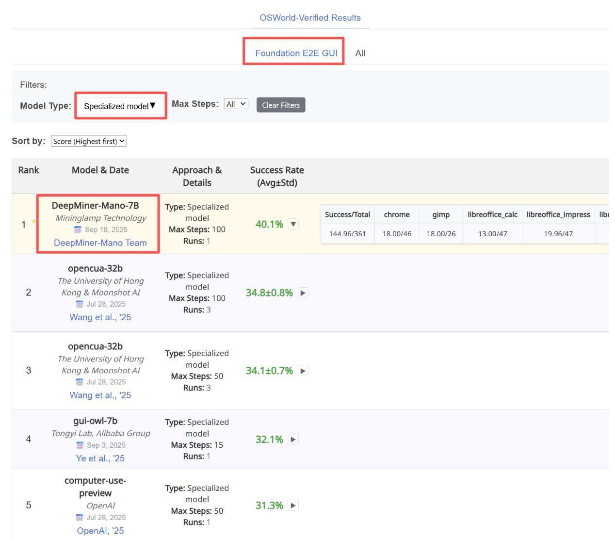 技術報告顯示,在OSWorld-Verified榜單的Foundation E2E GUI & Specialized Model 評測中,Mano直接把成功率提升到 41.6±0.7%,超過qwen、GUI-Owl、opencua等模型。
