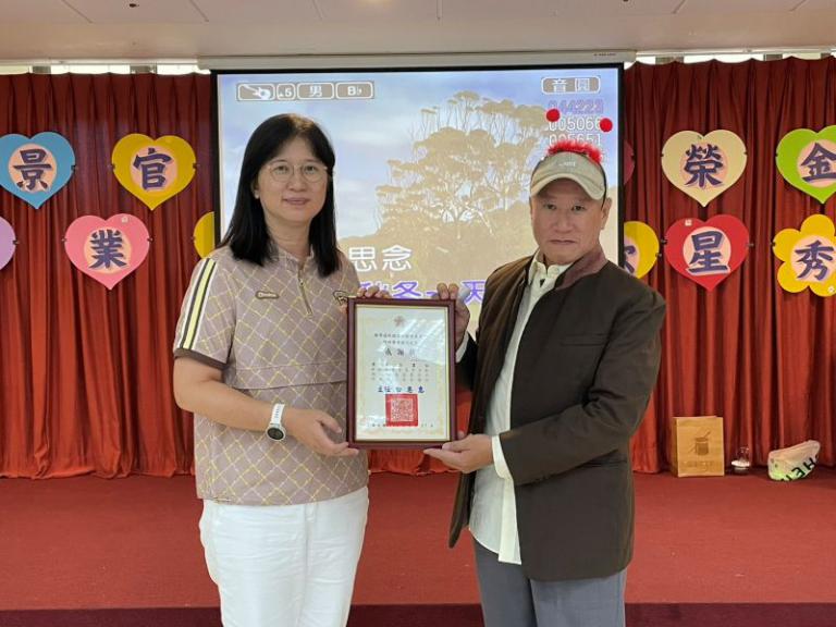 景官企業社林德利社長長期投入公益服務,今日帶來精彩紛呈的「金牌歌星秀」,演唱經典金曲,穿插趣味問答、魔術互動與點歌橋段,為住民長輩們打造一個充滿歡笑與感動的午後時光,榮家高勤官保健組長周育蓮代表致贈感謝狀,感謝林社長長年對長輩精神生活的關懷與支持。