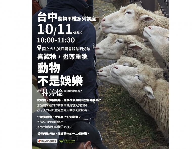 由台灣動物平權促進會主辦的「喜歡牠,也尊重牠:動物不是娛樂」講座,將於10月11日(六)上午10時在國立公共資訊圖書館黎明分館登場。主講人為長期關注展演動物議題的「鳥語獸躍」創辦人林婷憶,她將以多年第一線田野經驗,帶領民眾重新理解人與動物的關係,反思娛樂與教育背後的生命代價。
