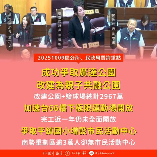 桃園市議會昨(9)日進行民政局及各區公所工作報告,桃園市議員王珮毓針對平鎮廣達公園改建及台66號橋下極限運動場開放時程提出質詢,要求市府加速推動相關工程,讓地方建設真正造福市民。