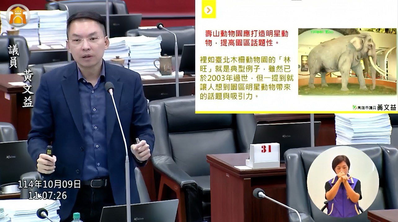 黃文益隨後將焦點轉向壽山動物園,要求市府公開113年度實際虧損金額與補助預算規模。他強調,動物園本就屬於教育與公共服務投資,虧損並非問題,但數據透明是基本原則。他進一步指出,壽山動物園歷經「新動物園運動」整建投入逾5.5億元,硬體改善可見,但整體人氣與回流率仍顯不足。黃文益表示,動物園除了教育意涵,更需要創造吸引力,才能讓親子家庭願意重複造訪。