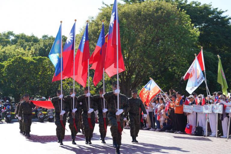 升旗典禮由海軍陸戰隊伍軍人協會護旗進場,在新竹縣泰雅之聲合唱團跨世代團員的領唱下,廣場民眾齊唱國歌、國旗歌,一起祝賀中華民國生日快樂。