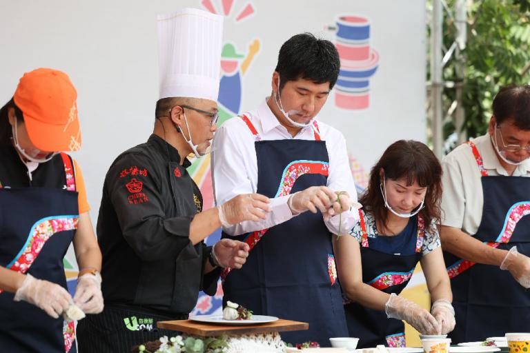 ▲客委會副主委邱星崴、柯志恩立委、林義迪議員、高市客委會主委楊瑞霞、謝鶴琳區長等貴賓與阿奇師製作創意料理。(圖/高婕)