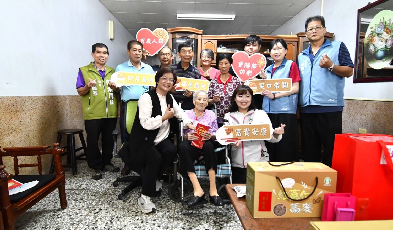 王惠美說,永靖的詹鎗阿公,今年已經103歲了,目前是永靖鄉最高齡的長輩,兒孫滿堂,五代同堂,大家族有70多人,詹阿公年輕的時候從事土水師,兒子現在從事建材,可說是事業傳承,希望長輩們都可以快樂生活,在地安養。縣府團隊積極推動社區照顧關懷據點,目前在永靖鄉也規劃興建長照衛福大樓,設置衛生所、不老健身房、育嬰中心、親子館、日照中心等,希望從0到100歲的鄉親都可以得到最好的照顧,祝福所有長輩們重陽節快樂。