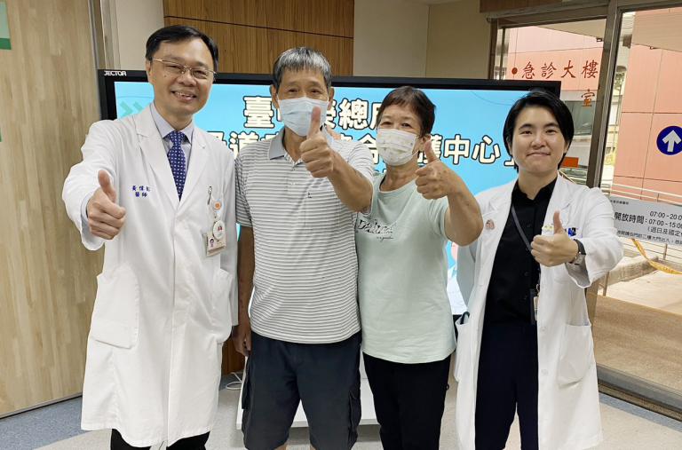 ▲71歲的詹先生(左2)為慢性肺阻塞患者,經臺中榮總胸腔部團隊採痰驗血,整合內、外特徵判斷病況後,給予生物製劑精準治療,(圖╱台中榮總提供)
