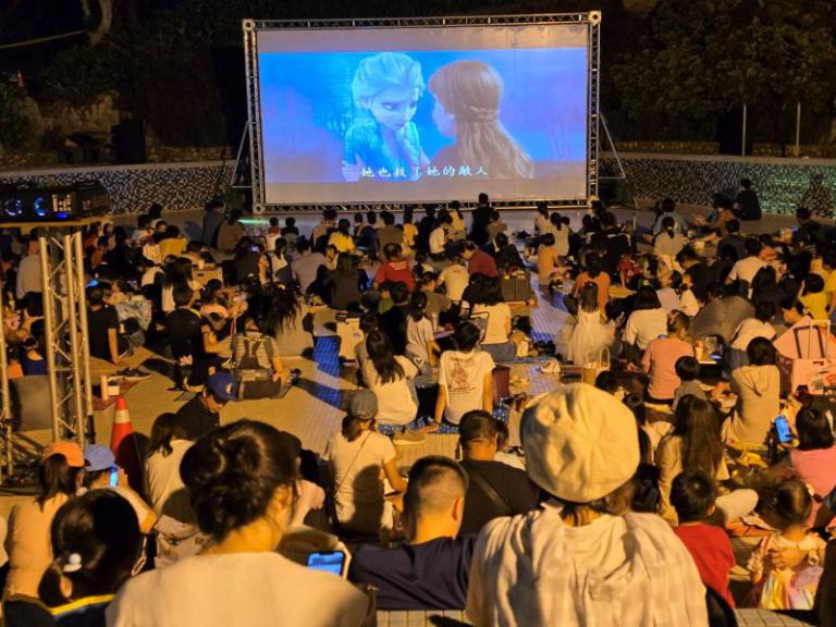 11日晚間播放的是深受全齡觀眾喜愛的迪士尼動畫《冰雪奇緣2》,隨著電影配樂響起,全場輕聲唱和,笑聲與音樂交織成歡樂氛圍,乾冰特效在銀幕前緩緩飄散,營造出奇幻場景,令現場觀眾驚呼連連,彷彿置身艾倫戴爾王國,現場提供免費爆米花與茶飲,香氣四溢,成為觀影時最受歡迎的小確幸。
