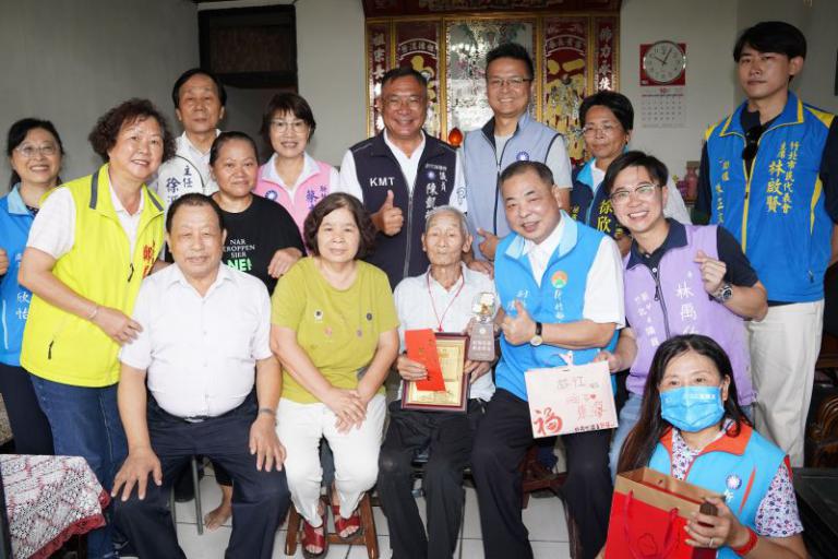 同樣是百歲的林江是今日拜訪7位人瑞之中,唯一的男性,林江看到眾人來拜訪,連忙起身招呼大家,他台語流暢,雖然行動緩慢,但家屬說他不僅能從一樓爬到二樓,頭腦靈敏,記憶力還很好,令眾人稱羨。