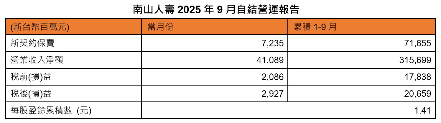 南山人壽公布9月合併獲利29.3億元,累計前9月自結獲利206.6億元,稅後每股盈餘(EPS)1.41元。