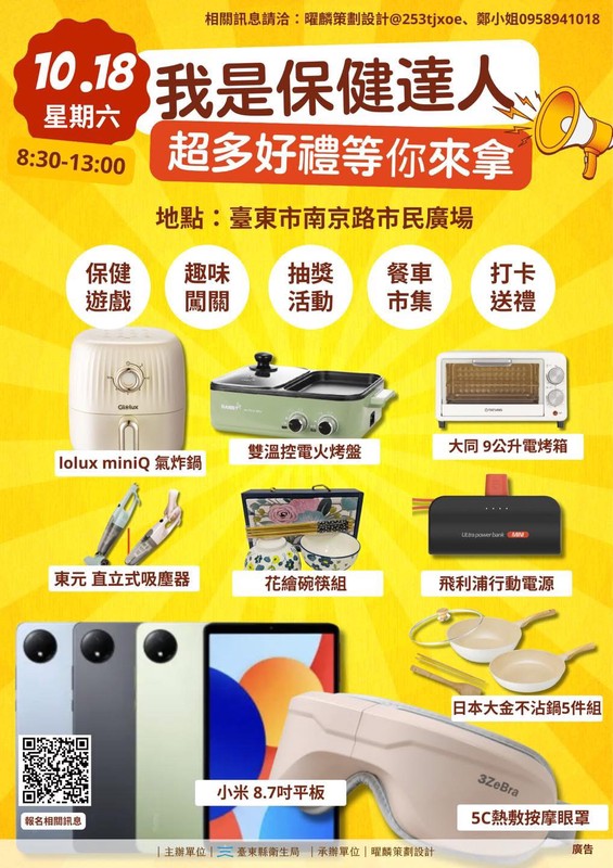 由臺東縣衛生局主辦的年度健康盛會「我是保健達人」活動,將於10月18日(星期六)上午8點30分至下午1點,在臺東市南京路市民廣場熱鬧登場。今年以「闖關集點.健康滿點」為主題,結合保健知識、趣味體驗、親子互動與健康飲食,打造一場適合全年齡參與的健康嘉年華。
