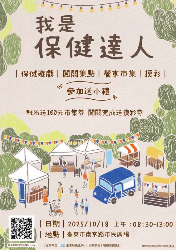 由臺東縣衛生局主辦的年度健康盛會「我是保健達人」活動,將於10月18日(星期六)上午8點30分至下午1點,在臺東市南京路市民廣場熱鬧登場。今年以「闖關集點.健康滿點」為主題,結合保健知識、趣味體驗、親子互動與健康飲食,打造一場適合全年齡參與的健康嘉年華。