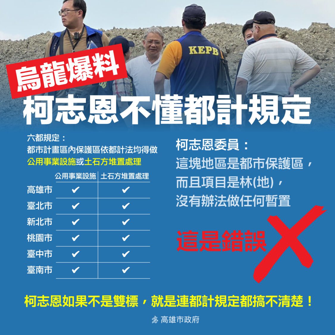 此外,高市府也多次說明,環保局開罰是因為廠商未做好標示、覆蓋,屬業者管理疏失,與當地可以合法堆置土石並無牴觸,現場也沒有盜採濫填。柯志恩委員無視客觀事實,刻意忽略高市府多次說明,把合法暫置場扭曲抹黑為盜採濫填,為了個人選舉造勢一再抹黑依法行事的公務人員,高市府對這樣惡質的政治操作無法接受。