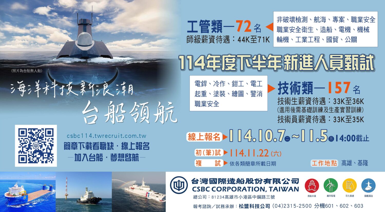 本次招考總計釋出工管類72名、技術類157名職缺,涵蓋從設計研發到現場製造的關鍵崗位。台船公司誠摯邀請有志於投入國防、綠能及智慧海洋科技的優秀人才踴躍報名。詳細招考職類、資格條件及薪資待遇等,請詳見本次甄試簡章及台船公司官網訊息。