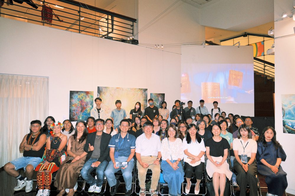 ▲卑南族藝術家楊慕仁個展「Pinilimayan石生繪世錄」自10/16(四)~11/21(五)在陽明交大浩然圖書館B1藝文空間,今(10/16)日盛大舉行開幕活動,全體與會來賓一同和藝術家楊慕仁(前排左4)合影。(圖/陽明交大提供)