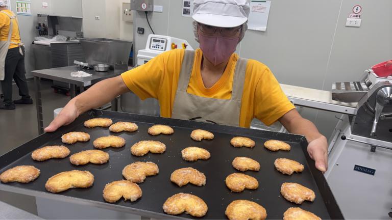 ▲憨兒展示烤好的餅乾。(圖/喜憨兒基金會提供)
