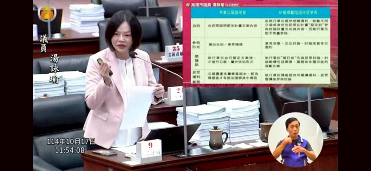 【今傳媒/記者李祖東報導】高雄市議員湯詠瑜今(17)日都市計畫委員會質詢,指出高雄都市計畫存在專業資訊落差,呼籲恢復「申護制」及參考北市民眾參與作法,與讓民眾提早參與規劃,且危老都更六都墊底,建議高雄建立在地化防災制度。