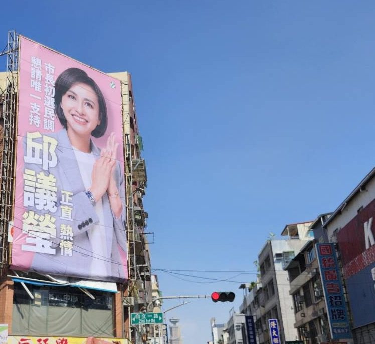 邱議瑩掛上鮮豔亮眼的粉紅色看版,在街頭格外吸睛,不僅吸引民眾目光,也讓選戰話題瞬間升溫。