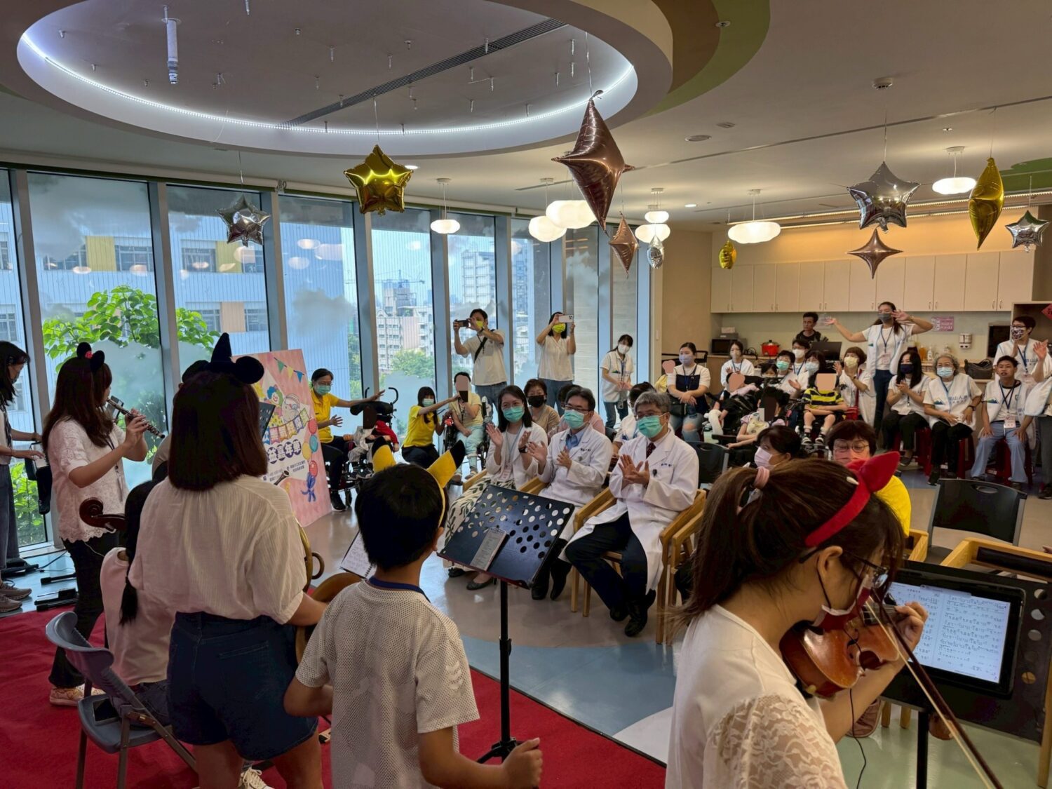 今日的活動中,氣球魔法師以創意造型與互動演出,為飛象家園帶來視覺與心靈的雙重驚喜。魔法師更親手為臥床孩童製作專屬氣球祝福,將快樂傳遞至機構每一個角落。此外,小豆芽室內樂團則以充滿童趣的旋律,陪伴現場親子,營造溫暖的心靈慰藉與深厚的情感連結。