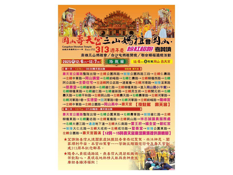 【焦點時報/記者張淑慧 報導】四大天后神光齊聚,聖母慈恩護佑台灣!為慶祝建廟313週年的盛大慶典,高雄岡山壽天宮將於民國114年12月6日(星期六)至7日(星期日),隆重舉辦「高雄三山媽祖&白沙屯媽祖會岡山」賜福遶境活動。這場宗教盛事不僅是地方信仰的焦點,更將寫下台灣媽祖信仰的新頁。