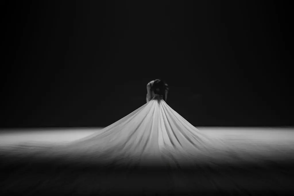 無垢舞蹈劇場30鉅獻《潮》彩排記者會_飾演白鳥的無垢舞蹈劇場首席舞者吳明璟,隨鼓聲旋轉上千次,最終發出一聲淒厲嘶吼,破冰而出©臺中國家歌劇院,攝影:林峻永