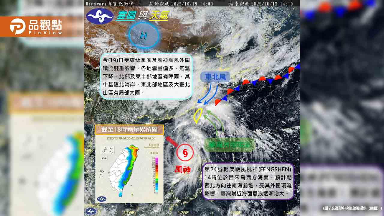 根據中央氣象署最新路徑潛勢預測圖顯示,輕颱風神正在南海向西北前進,逐漸接近海南島東方海面,預計將轉向西南。氣象專家吳德榮表示,雖然風神距離台灣逐漸遠離,但其外圍環流與東北季風共伴效應所產生的「秋颱效應」仍將持續影響台灣天氣。