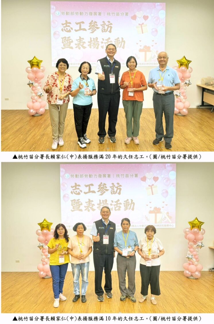 ▲桃竹苗分署今(20)日舉辦「114年度志工參訪暨表揚活動」表揚服務滿10年以上的8位久任志工及9位優秀志工,感謝他們多年來秉持服務熱忱,默默奉獻。(圖/桃竹苗分署提供)