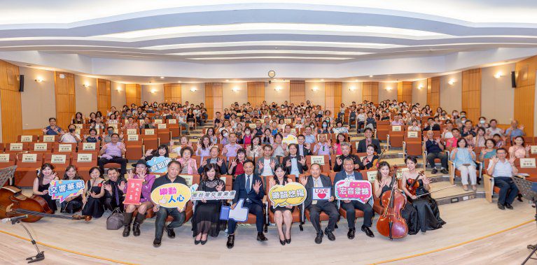 ▲書法大師蕭季慧老師(中間著紅衣者)致贈墨寶祝福義守大學。(圖/義守大學提供)