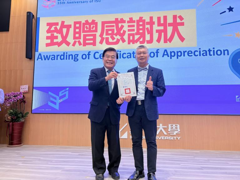 ▲義守大學(古源光校長)致贈感謝狀予校友總會(張世昌總會長)。(圖/義守大學提供)