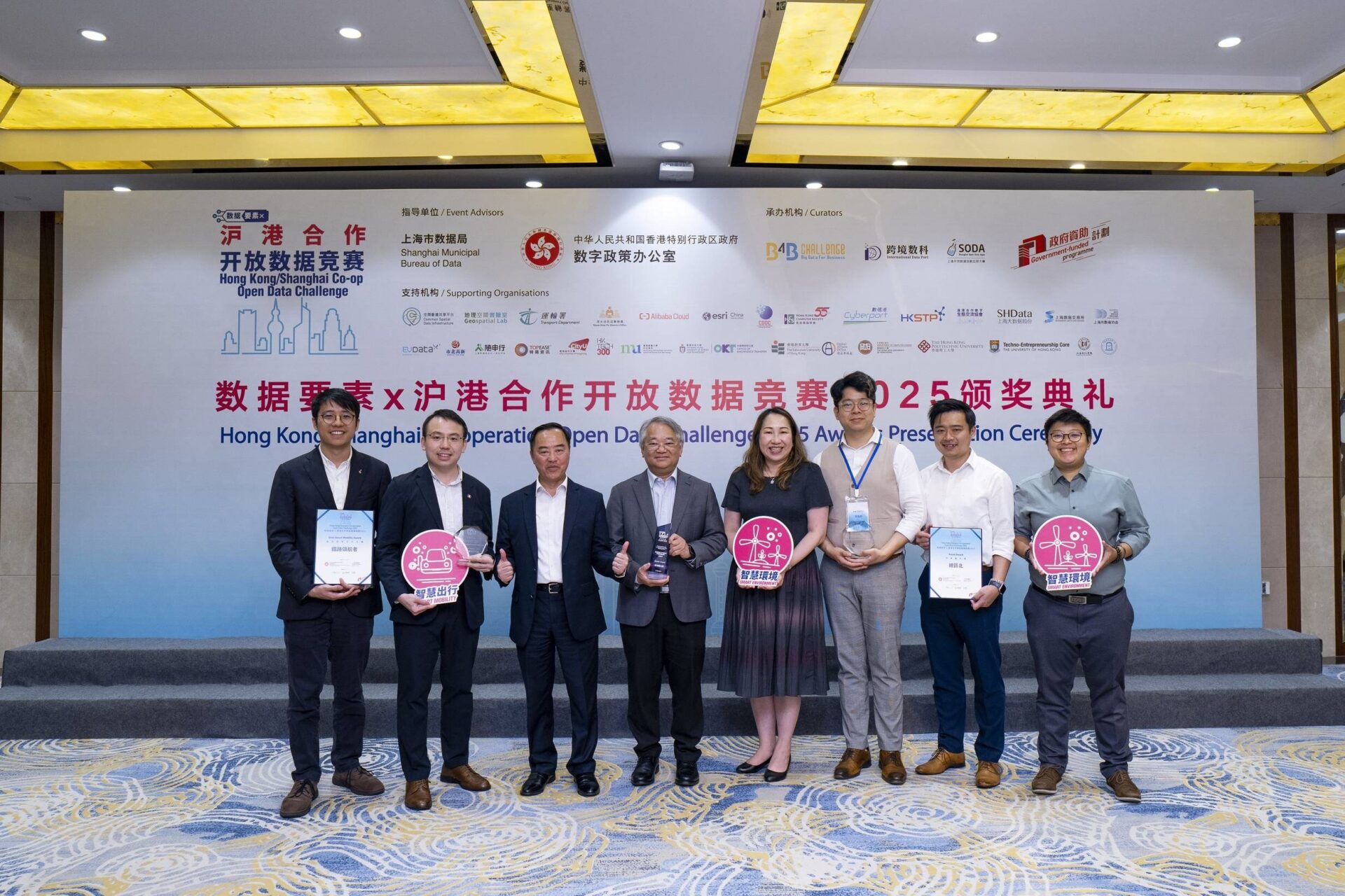 數字政策專員黃志光(左三)於上海舉行的「數據要素x滬港合作開放數據競賽2025」頒獎典禮與得獎團隊合照