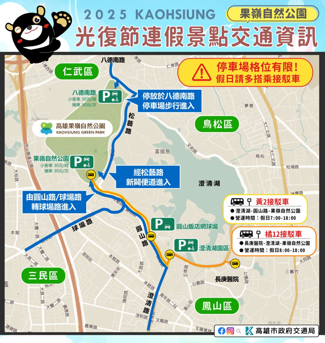 另「高雄果嶺自然公園」已於雙十節對外開放,因應人潮眾多,果嶺及八德南路二停車場皆會視滿場狀況啟動交通管制,請遊客注意管制資訊。另交通局在假日期間除已闢駛黃2區間車外,將增加橘12果嶺公園接駁線由長庚醫院(長庚路)發車,經澄清湖大門口提供往返果嶺公園的接駁車服務,營運時間為假日黃2區間車07:00至18:00;橘12為08:00至18:00。收取一段票費用。沿途設有「圓山路站」中途停靠,鄰近圓山飯店網球場停車場,方便彈性轉乘,歡迎多加利用。