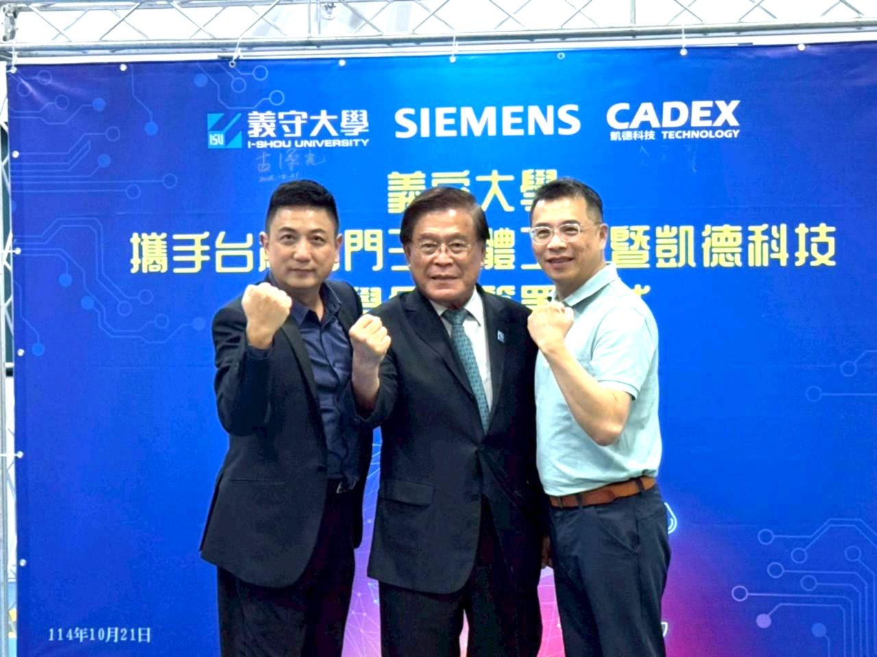 迎接全球智慧製造與AI革新的新浪潮,義守大學再度展開產學鏈結新篇章,今日(10/21)與台灣西門子軟體工業股份有限公司(以下簡稱台灣西門子軟體工業)及凱德科技股份有限公司(以下簡稱凱德科技)正式與簽署產學合作備忘錄。台灣西門子軟體工業慷慨提供 SEACAD100 SE Master Academic Bundle 教育版軟體共100套,共同啟動「數位製造即戰力」培育計畫。此合作象徵著一場以教育為核心、以人才為願景的嶄新學習旅程正式展開,義守大學亦將西門子全球頂尖數位製造技術正式導入校園,為教育注入創新能量,培育面向未來的產業新尖兵。