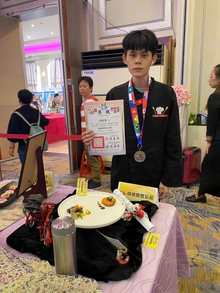▲餐飲管理系餐二A學生范凱恩參加精緻開胃菜展示項目,以精湛技藝與創意呈現榮獲銀牌。(圖/敏實科技大學提供)