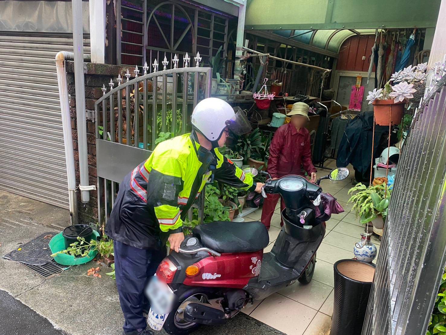 劉憬霖考量當時風雨未歇,擔心老婦獨自返家會發生意外,便主動請老婦坐上巡邏車,自己冒雨騎乘機車,將老婦與機車平安送回家裡,展現出專業與貼心的服務精神。