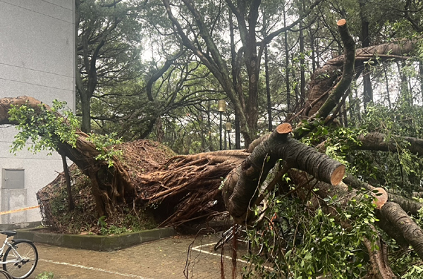 另有民眾一早到一所大學的校園散步時,驚見校園內一棵大樹也應樹倒地,校方則是派員將大樹鋸斷,以免傷人,也請相關人員進行整理;在校園內晨跑的民眾則是連連說可惜,這是大學校園內被稱為神樹的一棵大樹。