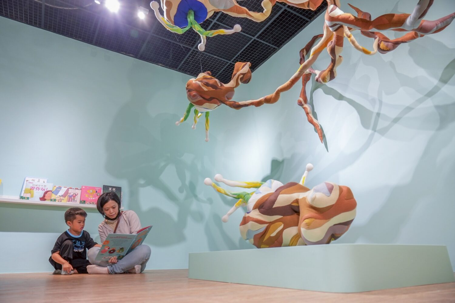 「物件再生」單元則探討藝術家如何賦予物件新的生命與價值。陳奕彰讓游泳圈化身巨型甜甜圈的〈甜甜的滋味〉顛覆了日常物件的既有想像;李明則重構了他蒐集的舊物件,創作出〈舊是寶〉讓老物件有了新生命;莊惠琳的〈聖物與剩物〉則透過在澎湖撿拾的海漂剩物,重新賦予廢棄物嶄新意義。走入「內在劇場」後,羅喬綾的畫作以快樂中略帶憂鬱的孩童形象,陪伴觀眾走出悲傷,獲得力量;林正〈大象背上的童年〉等作品則以幽默又療癒的卡漫人物,鼓勵觀者開心勇敢面對生活挑戰。而「情感抒發」展區中,描繪藝術家對家園與文化的情感,吳怡欣以細膩的插畫作品〈從灶火到餐桌〉描繪著對家庭的牽掛;吳耿禎以編織解構剪紙,重新織就出島嶼文化中的精神性;鄧文貞透過纖維創作出〈紅龜粿〉、〈大腸包小腸〉等作品,重拾兒時對傳統文化與夜市美食的回憶。最後,在「環境感知」中,盧建銘將平日蒐集看似垃圾的材料,轉化為極具創意與想像力的作品,獻給在工業與自然之間成長的小朋友。展場並規劃了多樣化的互動創作區,透過色彩、光線、黏土、剪紙和編織等不同媒介,邀請大小朋友一起體驗,創作屬於自己的作品,並將藝術帶入生活。