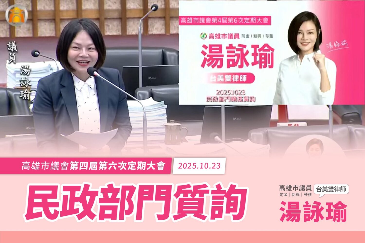 高雄市議員湯詠瑜今(23)日質詢民政部門,針對公務組織面臨世代挑戰,及工作壓力造成人力問題提出關心,她也要求面對淨零轉型,應盡速建立公民參與機制,且資訊處參訪日本電子資訊展,建議要將考察成果具體轉化為市政作為。