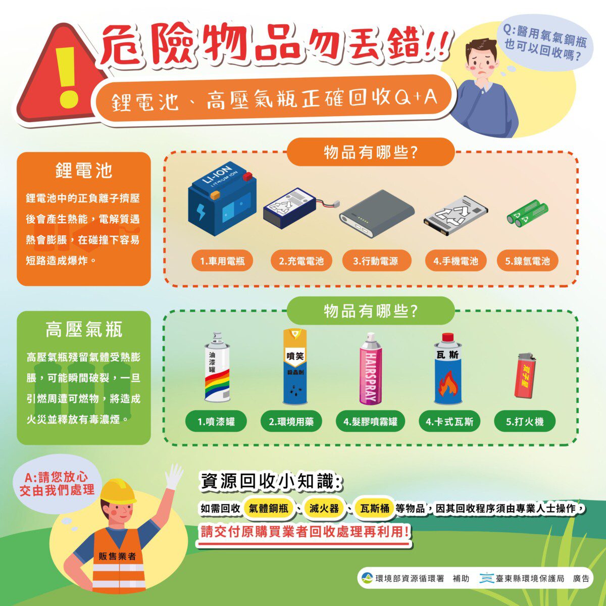 臺東縣環保局指出,行動電源、手機與筆電電池、卡式瓦斯罐、噴漆罐、打火機瓦斯罐等,若混入一般垃圾,經垃圾車壓縮或回收場高溫曝曬,極可能瞬間爆炸起火,危及清潔隊員與社區安全。若經勸導仍屢犯者,依據廢棄物清理法,可處新台幣1,200元以上至6,000元以下罰鍰,請民眾切勿任意丟棄。
